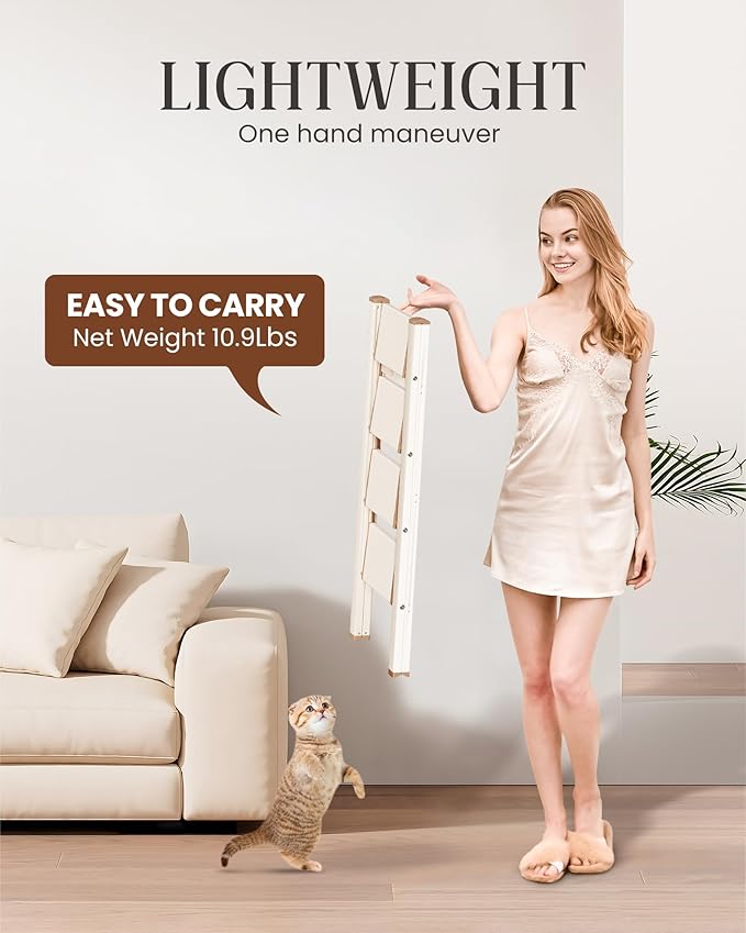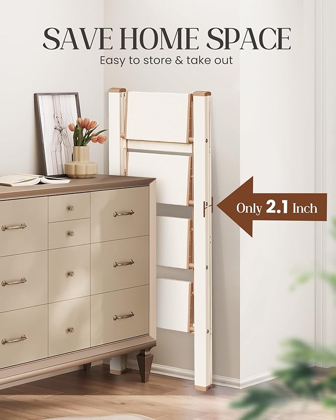 - SPACE-SAVING DESIGN: This folding step stool comes fully assembled! Unfolded:18.1"W*32.2"L*44.1"H, Folded:18.1L*2.1"W*46.1"H, Net Weight:10.9Lbs. The 4 step ladder is only 2.1" when folded, suitable for family who owns limited space.
