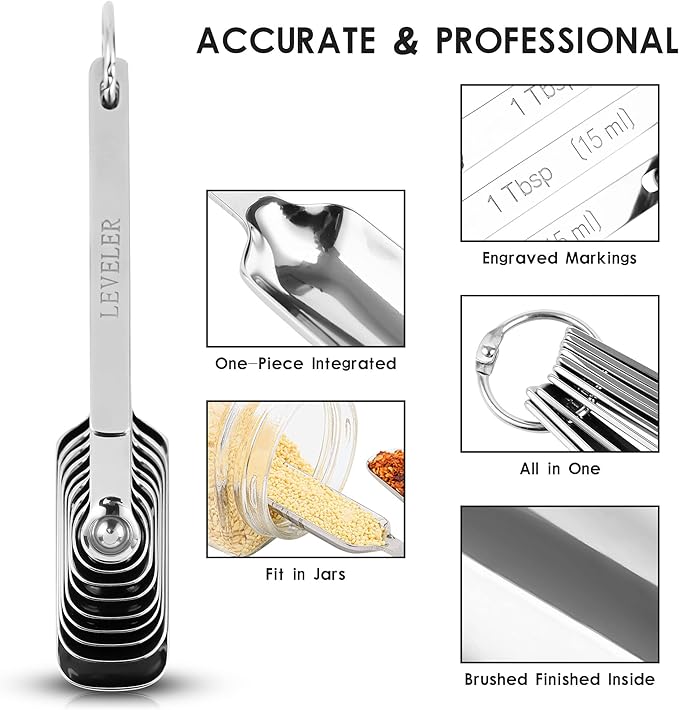 - Quality measuring cups and spoons set 17: The materials are 18/8 stainless steel, They will not be polluted or eroded, proof, lead-free, BPA-free, durable and eco-friendly it is very practical and durable. Quality steel make it <br>dishwasher-safe, which is safe to use for both dry and wet ingredients.