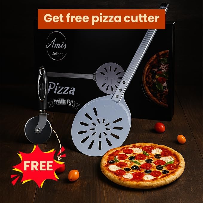 Ami’s Delight 8" Perforated Pizza Turning Peel With Free Pizza Wheel Cutter | Lightweight Aluminum Pizza Peel Turner Spiner with Long Handle | Pizza Oven Accessories