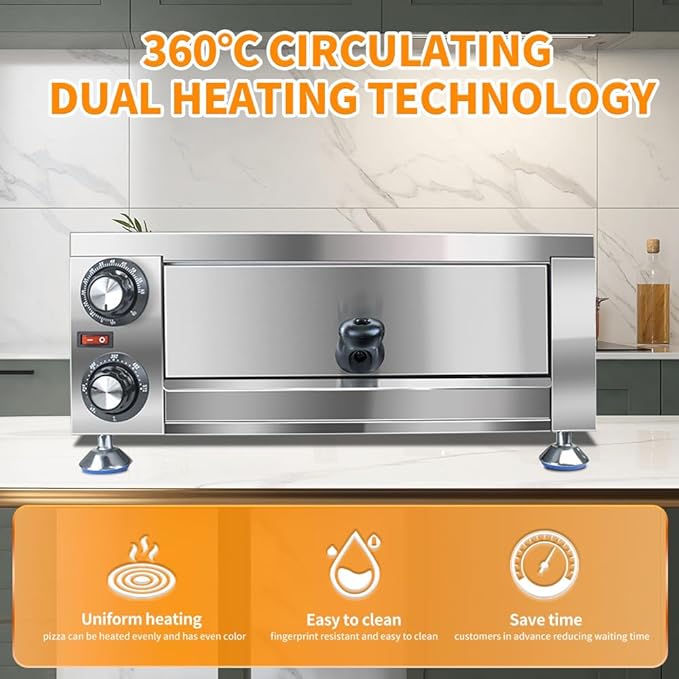 - Commercial Pizza Maker can be customized to adjust the temperature, the temperature range is 0~300°C (0~572°F), you can set different temperatures for different foods such as pizza, cakes, bread rolls, pies, baguettes and so on according to your personal preference.