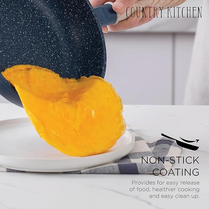 Country Kitchen Non-Stick Cast Aluminum Cookware Set - Durable Kitchen Cookware for Everyday Cooking, Navy Round Handle, 11 Pc.