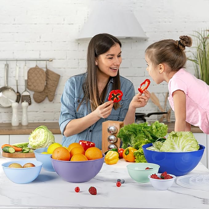 - 🍓【Stackable & Easy to Clean】: These nesting mixing bowls for kitchen can be stacked on top of each other to save space. The plastic bowls with lids are top-rack dishwasher friendly and can also be hand washed with soap and water (avoid the use of abrasive sponges).