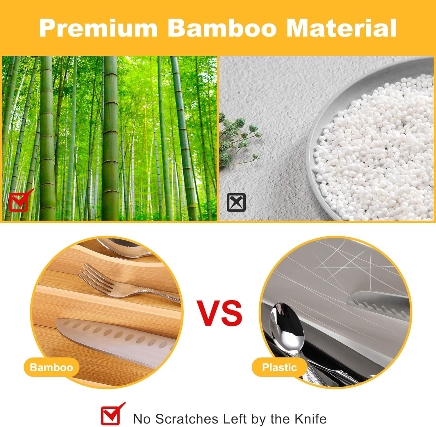 - â ăSturdy and Well-madeăOur silverware tray for drawer is made of minimally refined natural bamboo, a renewable, sustainable source, making them a green choice, with the age of over 4 years, which makes the silverware holder durable enough for long time use. Unlike the plastic and metal drawer organizer, our flatware & utensil is water & odor resistant, the silverware organizing tray is perfect for years of use, especially in kitchens where things can get messy quickly.
