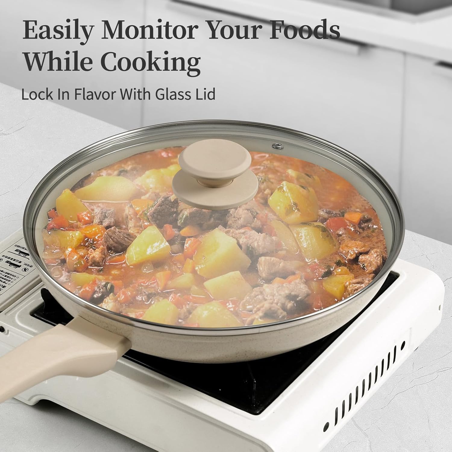 - 【Durable Body and Unique Design】The nonstick cookware set has a flat base, the oil doesn't run around, ensures the foods even heat distribution. The frying pan set features a durable five layers structure for super non-stick performance and durability. The ergonomic heat resistant handle offers a better grasp and stay cooling feeling. The stackable frying pan set with hole, convenient for hanging, enough save space for kitchen. The pots and pans set is excellent kitchen essentials for new house