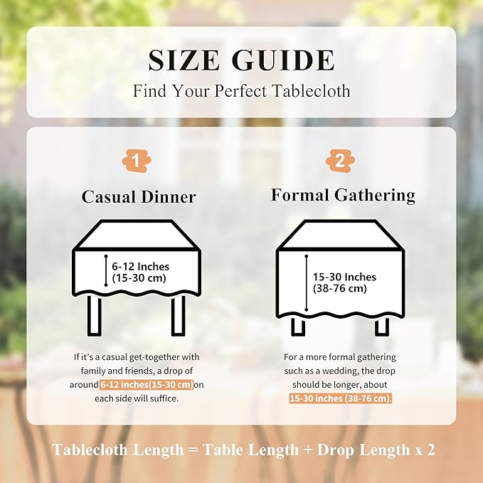 - Size Size Size: You will get 60''W x 108''L table clothes,please measure your table correctly to get better dropping effect. If it’s a casual get-together with family and friends, a drop of around 6-12 inches (15-30 cm) on each side will suffice. For a more formal gathering such as a wedding, the drop should be longer, about 15-30 inches (38-76 cm).