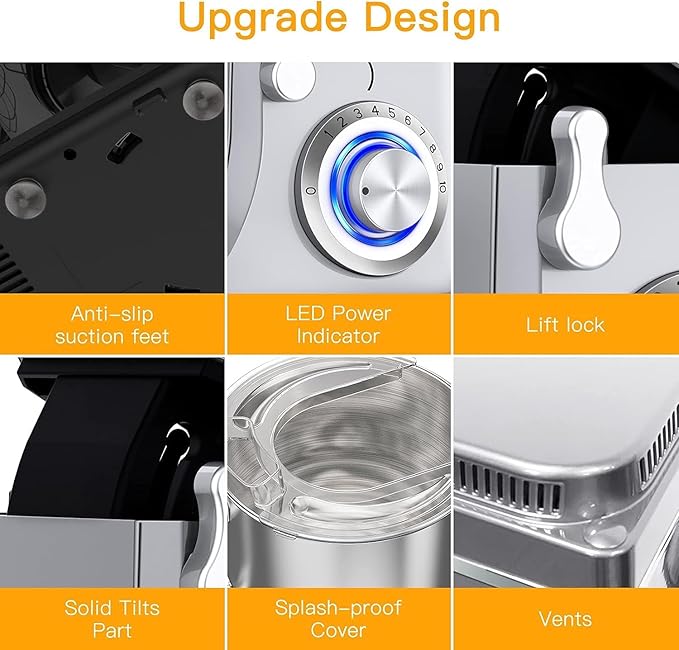 - Tilt-head & Anti-slip Design: Easily install or uninstall the bowl and accessories with the tilt-head design. The 6 anti-slip silicone suction cups and solid connecting rod ensure stability, reducing vibration and noise. The dough machine stops working when you lift the top half for added safety during kneading