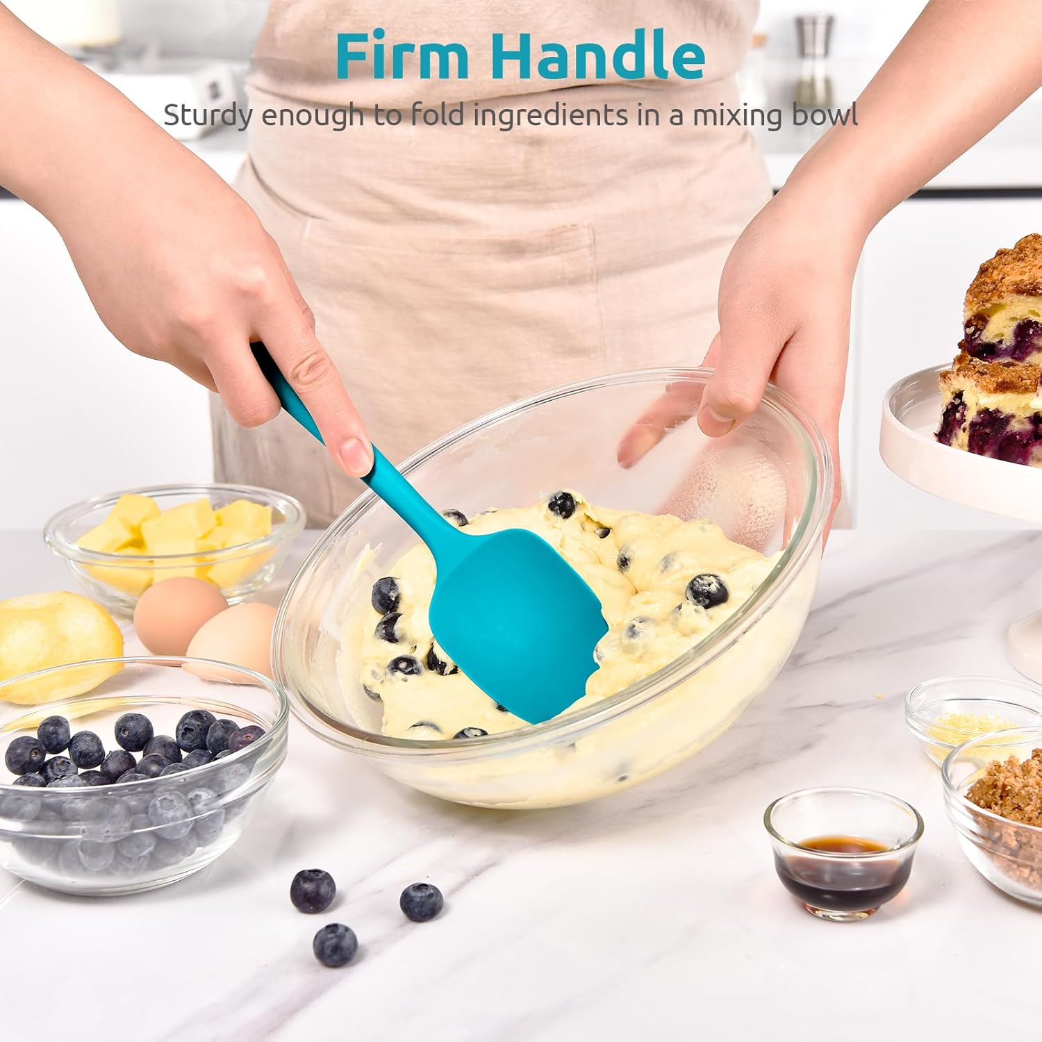 - [Sturdy Enough with Upgraded Core to Fold Ingredients in a Mixing Bowl] The handle of U-Taste baking spatula is firm all the way up to the center of the tool, with the softening increasing out to the edge. We upgraded the core so the cooking spatula doesn't bend through the handle and cause it to collapse and the core won't come through the mixing spatula. It's strong enough to stir thick mashed potatoes and fold blueberries into a coffee cake.