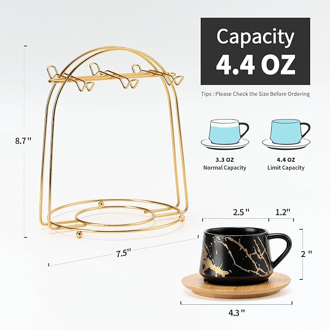 - 【SAVE COUNTER SPACE】 Each Cup: Dia:2.5", H:2". Capacity(full): 4oz /130 ml. Each saucer: Dia:4.3 ", H:0.5 ".The combination of the coffee cup set and the iron frame can prevent the cups and saucers from being randomly placed.They are the best collocation in your life.