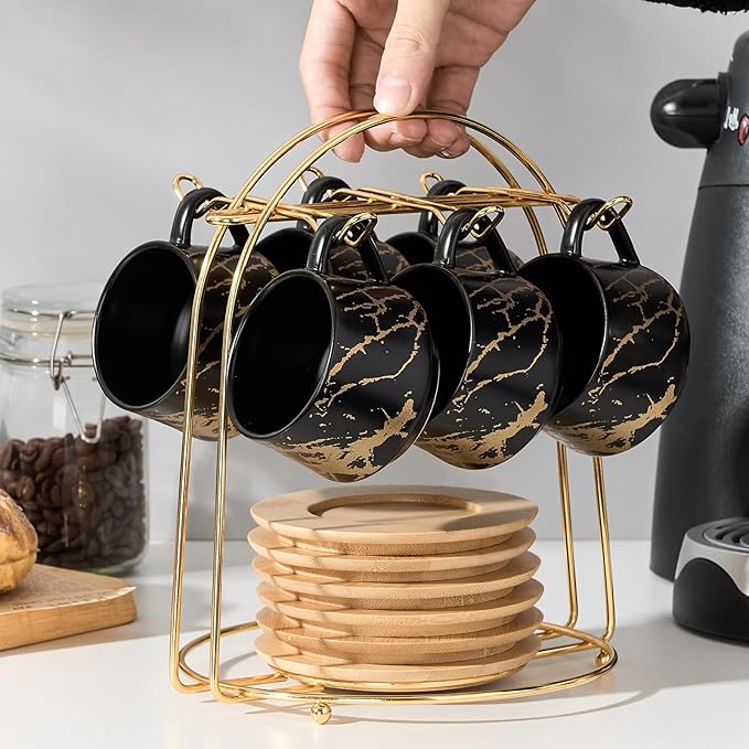 LUKA Ceramic Espresso Cups with Saucers and Metal Stand, Small 4 oz Porcelain Demitasse Cups Set of 6, Cute Cappuccino Coffee Cups for Double Espresso, Tea, Marbling Black