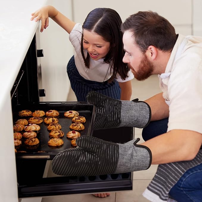 - 【Silicone Strips】 Enhanced with Silicone Strips: These oven mitts are equipped with premium silicone strips on their surface, adding an extra layer of protection and significantly increasing their resistance to heat.