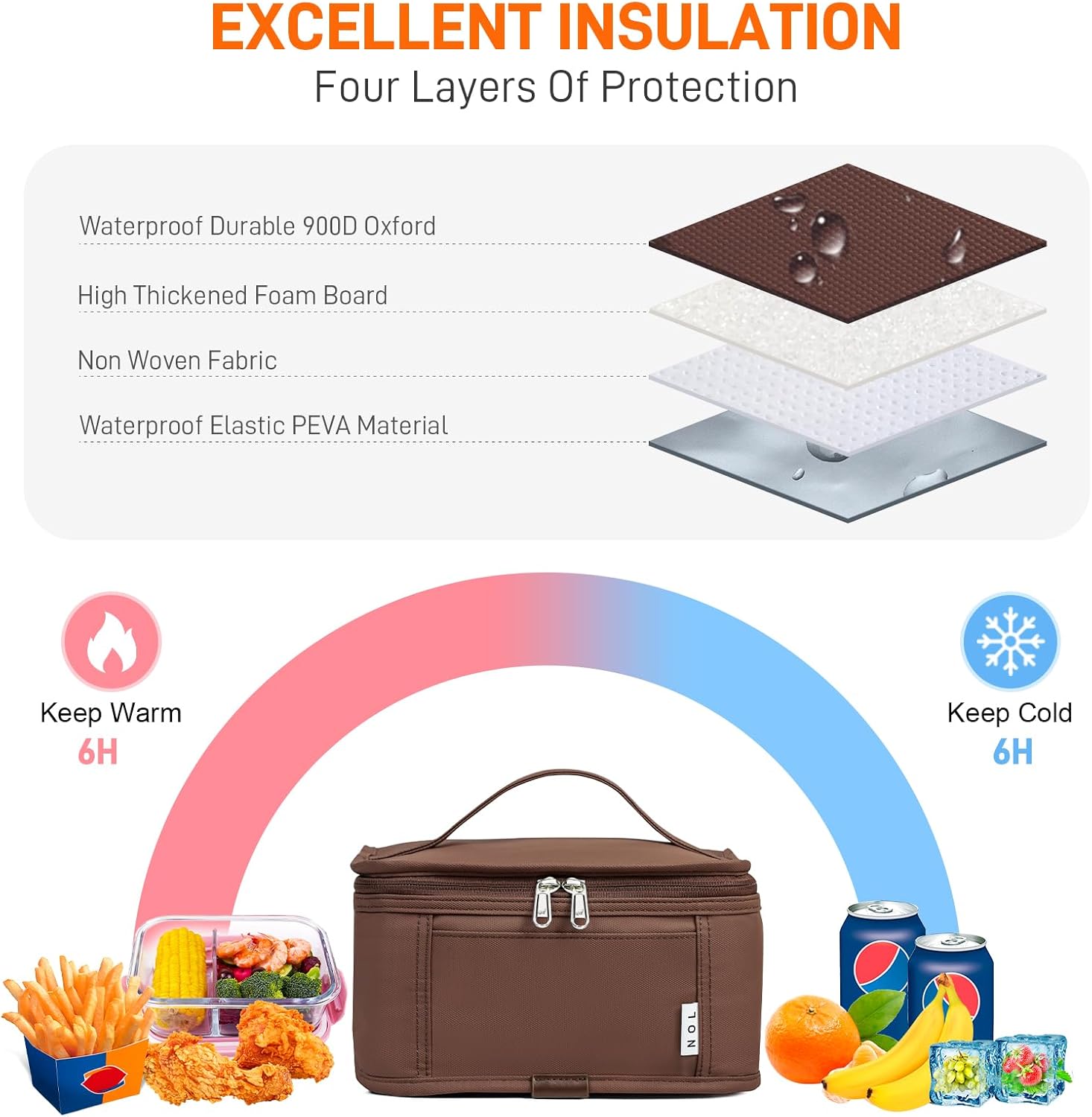 - Premium Material: NOL mini reusable lunch bag is made of the highly quailty 900D Polyester, the inner layer is PEVA material and the middle layer is specially filled with 5mm thick insulating lining, which provide great insulation to keep the food warm or fresh up to 3-4 hours.The double zippers of the thermal bag are made by NOL, very smooth and resistant.