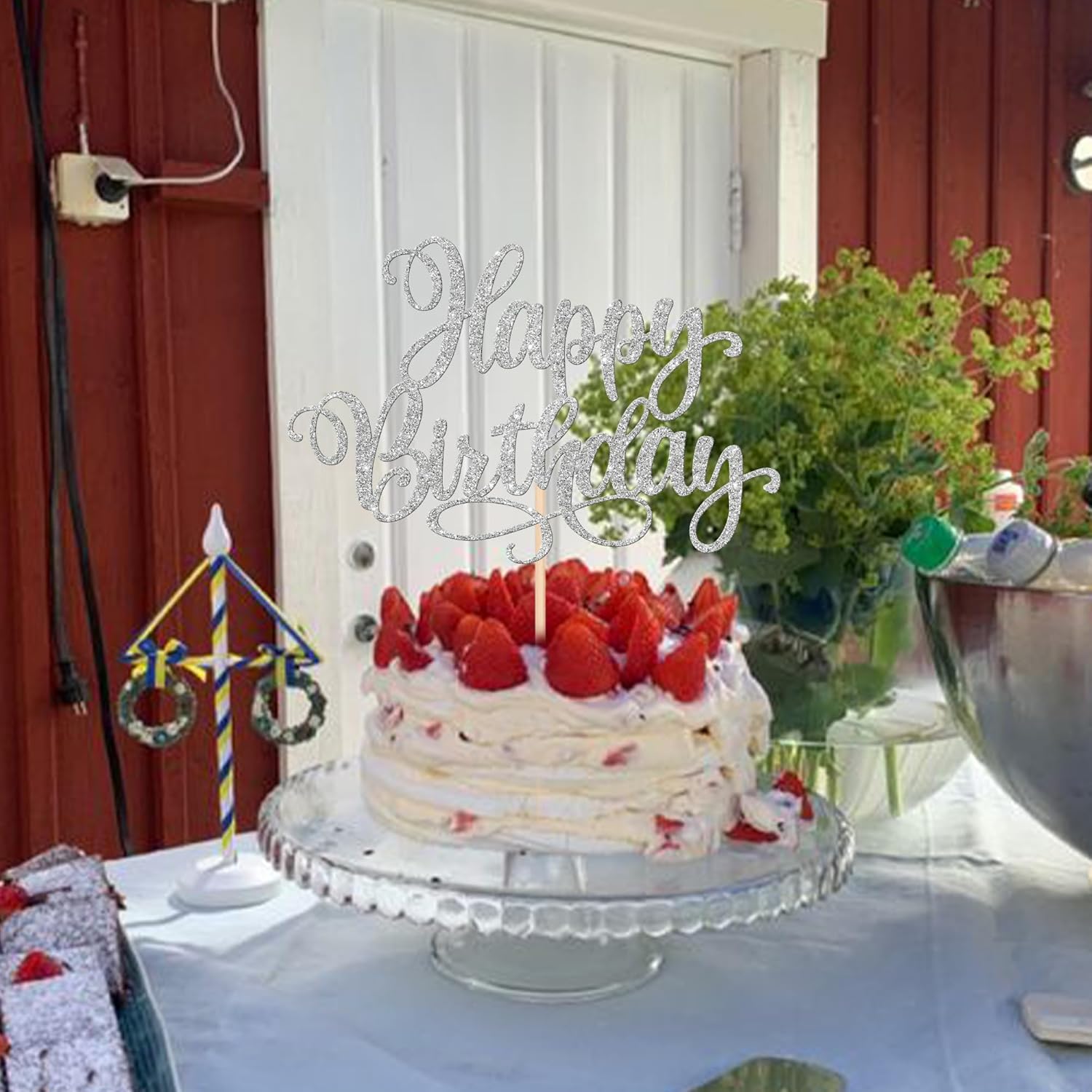 ZHUOWEISM 1 PCS Happy Birthday Cake Topper Glitter Happy Birthday Cake Pick for Celebrating Happy Birthday Anniversary Party Cake Decorations Supplies Silver