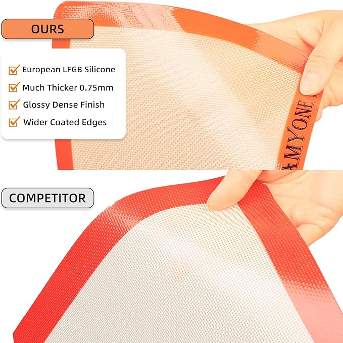 - đ§ăEXCEPTIONAL QUALITY & SAFETYăCrafted from the finest food-grade silicone and internally reinforced with fiberglass, this mat meets the highest standards of quality and safety. With a thickness of 0.75mm and with glossy dense finish as well as wider coated edges, these baking mats for 11-inch square sheets, are designed to withstand temperatures ranging from -40°F to 480°F (-40°C to 249°C), making it suitable for a wide range of baking needs.