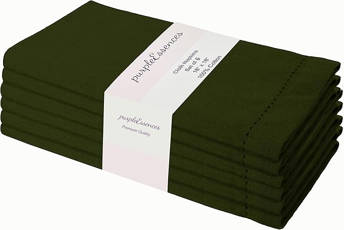 PurpleEssences Set of 6 Hemstitch Cloth Dinner Napkins 100% Cotton - Soft Durable Washable - Ideal for Wedding Christmas Holiday Winter - Perfect Everyday Use Table Linen 18x18 - Olive Green