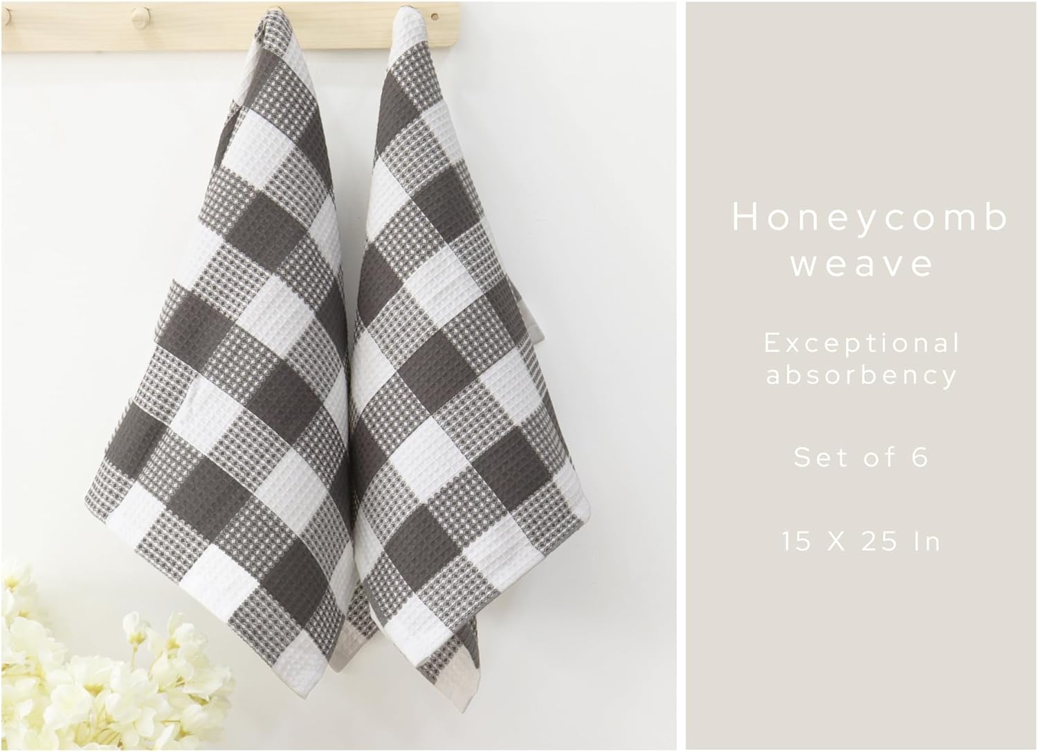 PurpleEssences 100% Cotton Waffle Weave Check Plaid Kitchen Towels, Super Soft and Absorbent Dish Towels for Drying Dishes 15 x 25-6 Pack - Spring Summer - Steel Grey and White