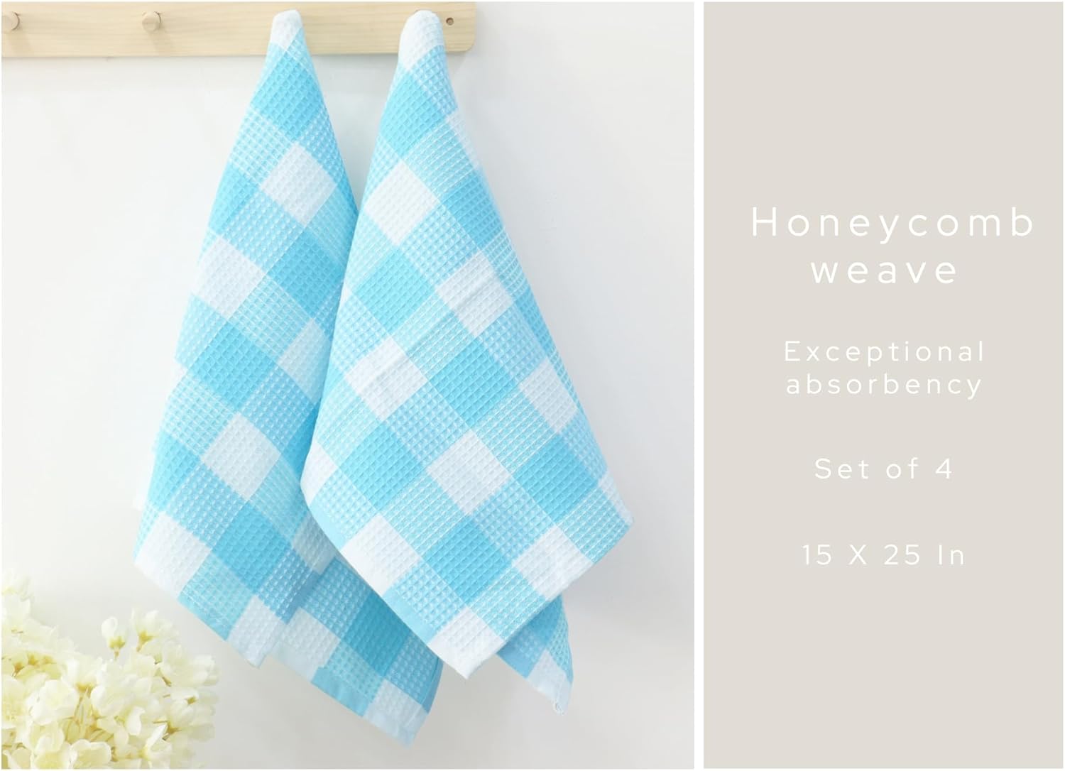 - Pack of 4 Waffle Weave Dish Towels measuring 15 by 25 Inches.