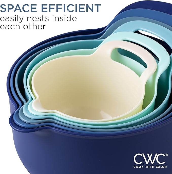 COOK WITH COLOR Nesting Plastic Mixing Bowl Set with Pour Spouts and Handles, Blue, 6 Piece Non-Slip