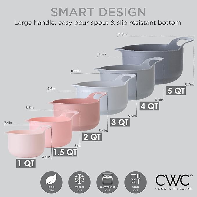 - Cook with Color 6 piece mixing bowl set - non slip bowls with pour spouts and handles; easy to clean, sturdy mixing bowls.