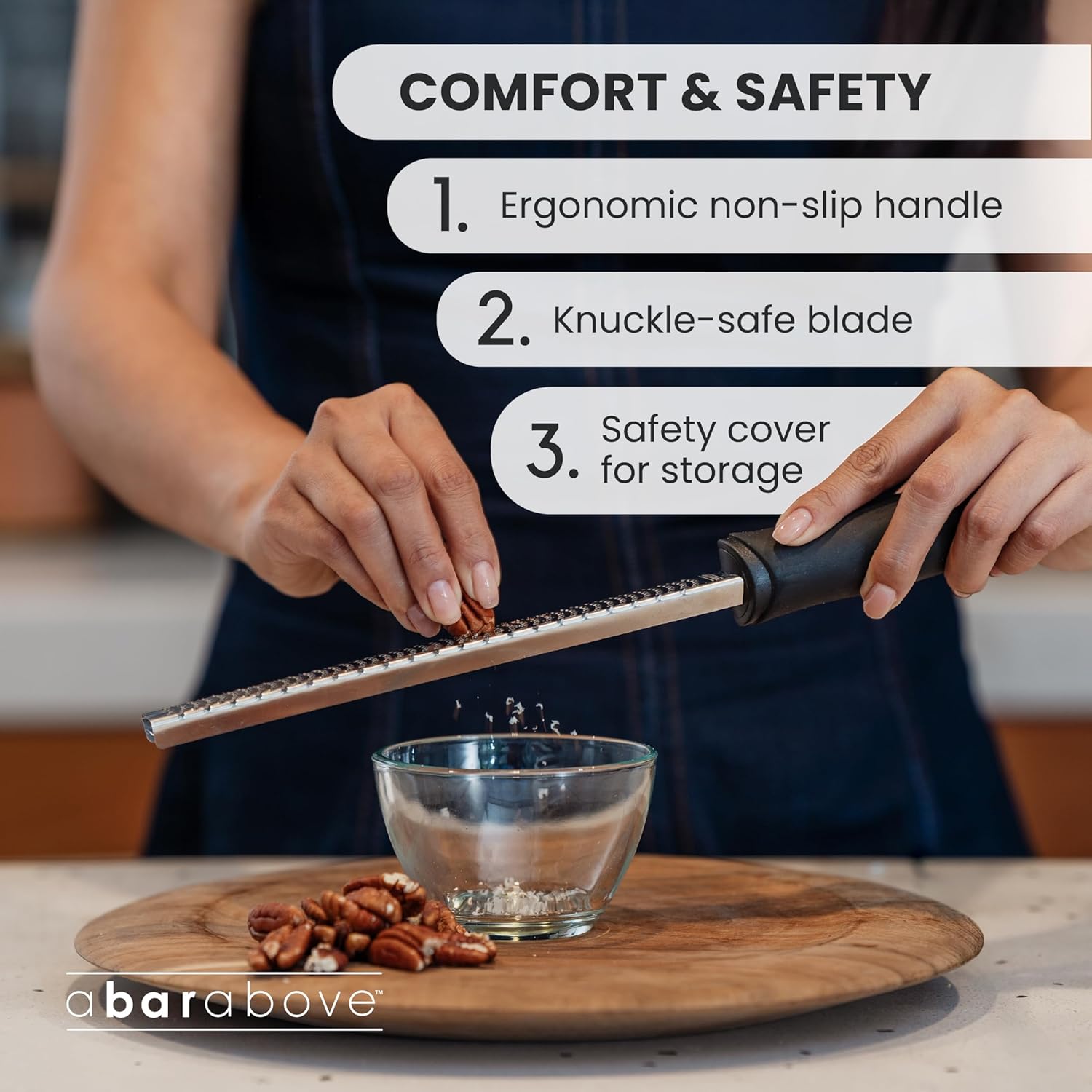 • BACKED BY A BAR ABOVE: Most graters feel like disposable gadgets, but this blade is different because it was designed in California by a professional bartender and built with the craftsmanship pros demand. More than a kitchen upgrade, it is a precision tool for people who care about doing things right. Packaged in a premium kraft box, it makes an impressive gift and comes backed by USA based customer support plus A Bar Above’s full commitment to quality. Use it once and you will never go back.