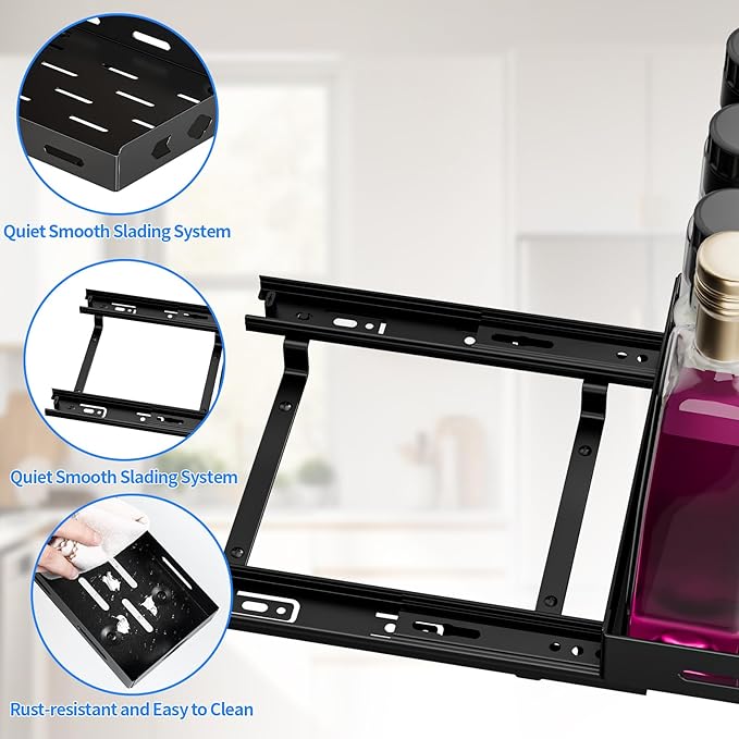 - Quiet Sliding and Compatible with More Cabinets: Our vertical spice rack pull out is design with a quiet ball bearing system that ensures a smooth and noiseless slide out, so you can easily slide the spice rack slide out. The full-extension slides allow you to easily access all the spices in your cabinet. The upgraded spice organizer, with a raised bottom design, is compatible with cabinet frame that are slightly higher than the inside of the cabinet, making it perfect for use and the perfect spice storage solution for almost any cabinet.