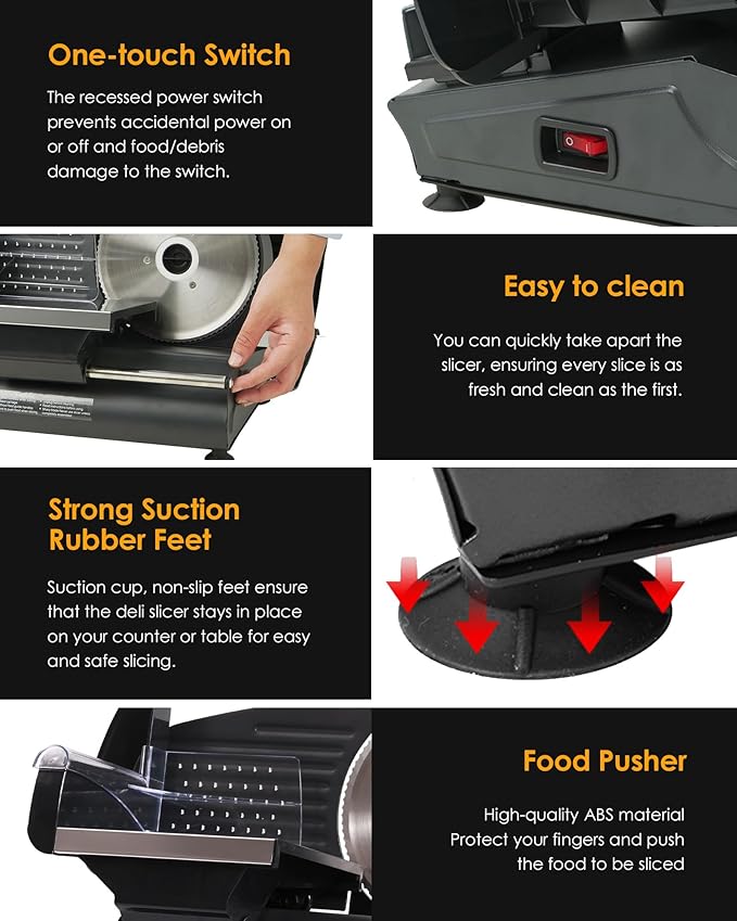 - EASY TO CLEAN: The electric meat slicer’s seamless design and removable parts make cleaning effortless. With the blade, food carriage, and food pusher all being removable, it ensures a thorough and hygienic cleaning process.