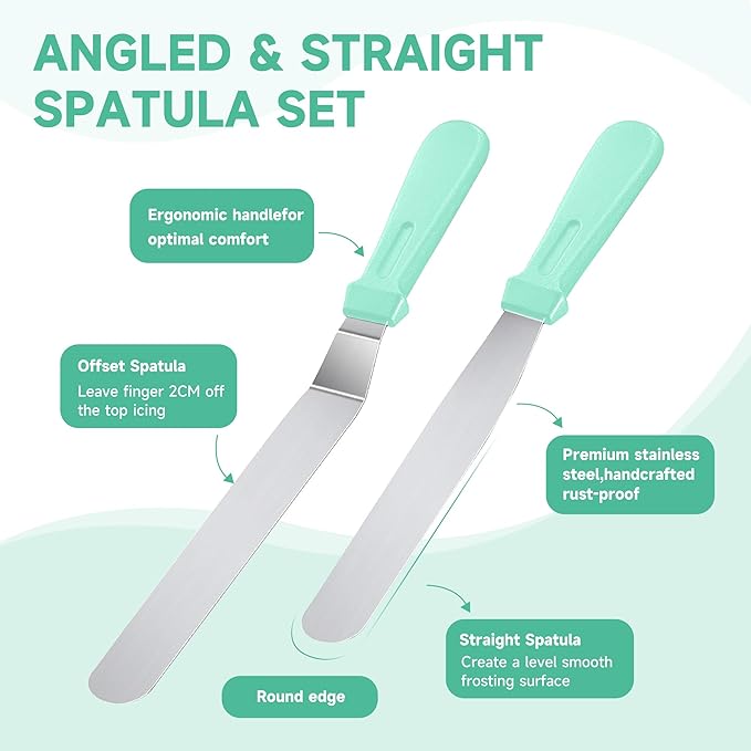 - CAKE DECORATING TOOLS :Our cake set includes scrapers, nozzles, a syringe & cake cutter, flower nails, flower lifter, straight brush, disposable bags & many more Must-Have items you'll love learning to perfect & master. Share the frosting flower fun with friends & family