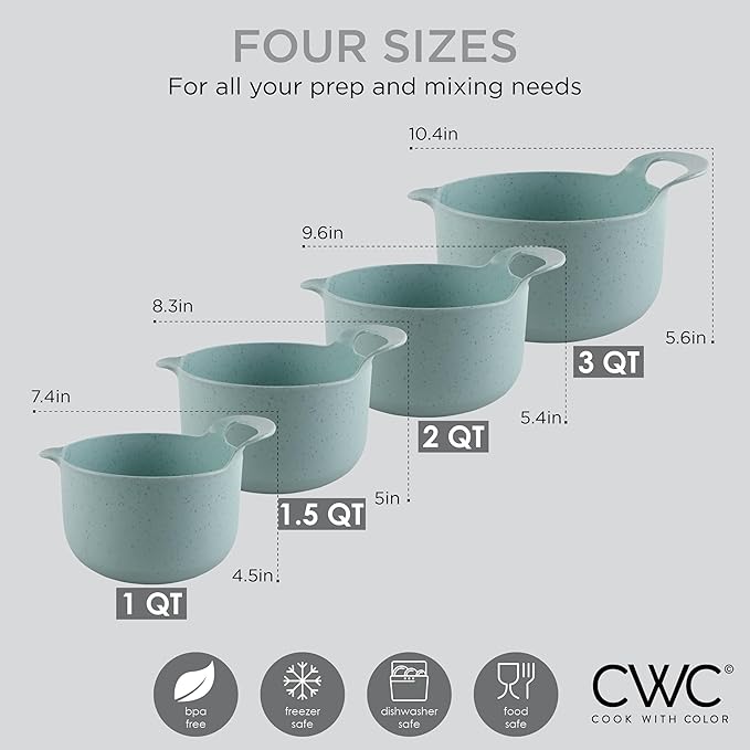 - Cook with Color 4 piece mixing bowl set - non slip bowls with pour spouts and handles; easy to clean, sturdy mixing bowls.