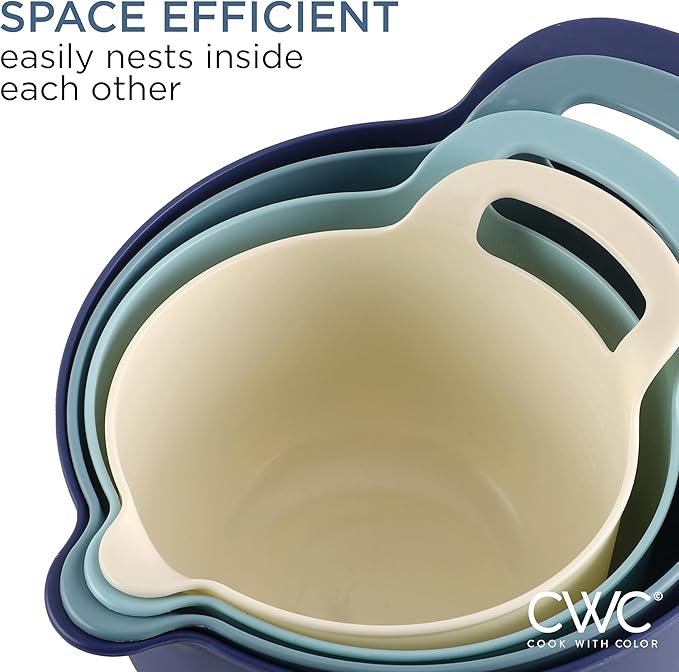 - Cook with Color 4 piece mixing bowl set - non slip bowls with pour spouts and handles; easy to clean, sturdy mixing bowls.