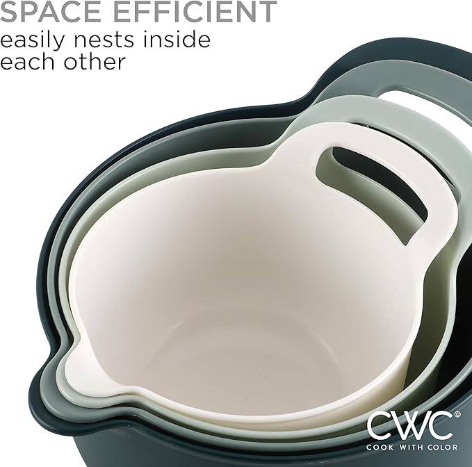 - Cook with Color 4 piece mixing bowl set - non slip bowls with pour spouts and handles; easy to clean, sturdy mixing bowls.