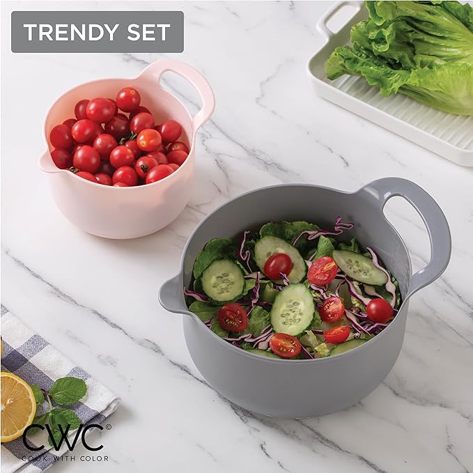 - Cook with Color 4 piece mixing bowl set - non slip bowls with pour spouts and handles; easy to clean, sturdy mixing bowls.