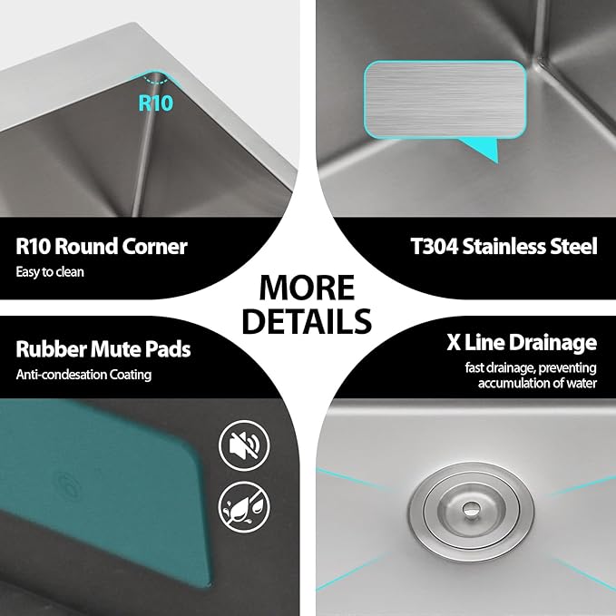 - Excellent Water Drainage: The rear-set drainage hole design maximizes cabinet space. The sloped sink bottom with innovative X-shaped drain grooves ensures quick water drainage and prevents pooling