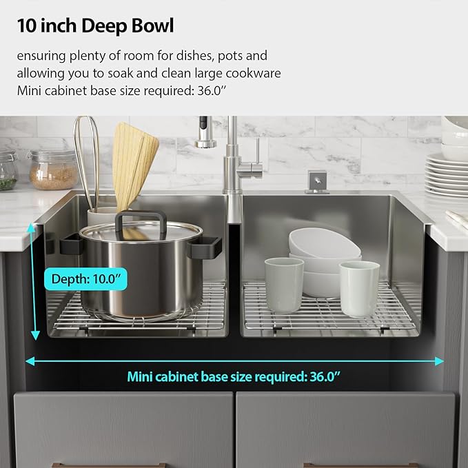 - Premium material:The 33 inch kitchen sink double bowl is constructed from heavy-duty,rust-resistant 16-gauge T-304 steel with thickened plate for exceptional dent and wear resistance. The commercial-grade brushed finish ensures high resistance to heat and stains