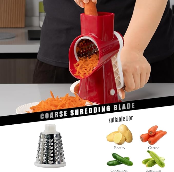 - QUICK ROTARY GRATING - It's very easy to get started with this multifunction vegetable grater. Put the food into the hopper and rotate the crank, You will grate the cheese into pieces and get shreds from vegetables for salads and pasta. Save lots of time and no need to touch the blades when using this vegetable grater.