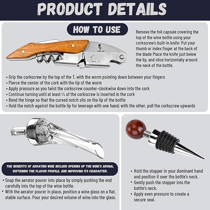 - PERFECT GIFT: Whether you're a wine connoisseur or just starting to explore the world of wine, our all-in-one set is the perfect gift for any wine lover. Its elegant design, premium quality, and multifunctionality make it a must-have accessory for any wine-drinking occasion.