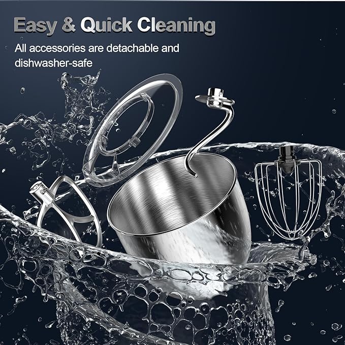 - 【Low-Noise & Overheating Protection】 Utilizing Aerodynamic Theory to reduce the resonance of the cook mixer's internal chamber, with high quality bearing parts, resulting in less than 60 dB of noise. Overheating protection ensures longer dough mixer life.