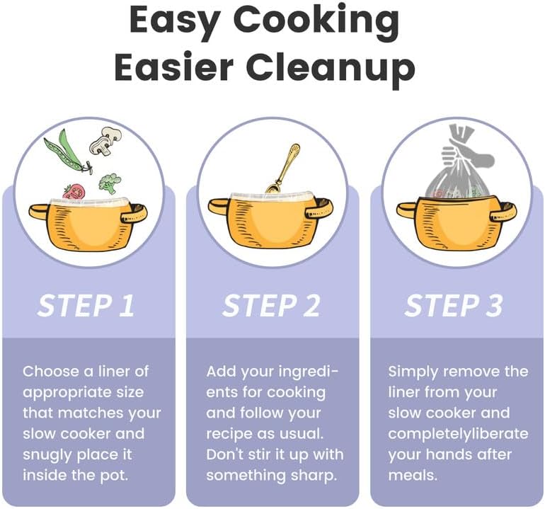 - 【Easy to Use】Three packs, each pack contains 10 slow cooker liners, sized 8"x11", stacked individually in a resealable bag for easy single-sheet use. Just line your slow cooker, cook, and toss for a No-hassle clean-up