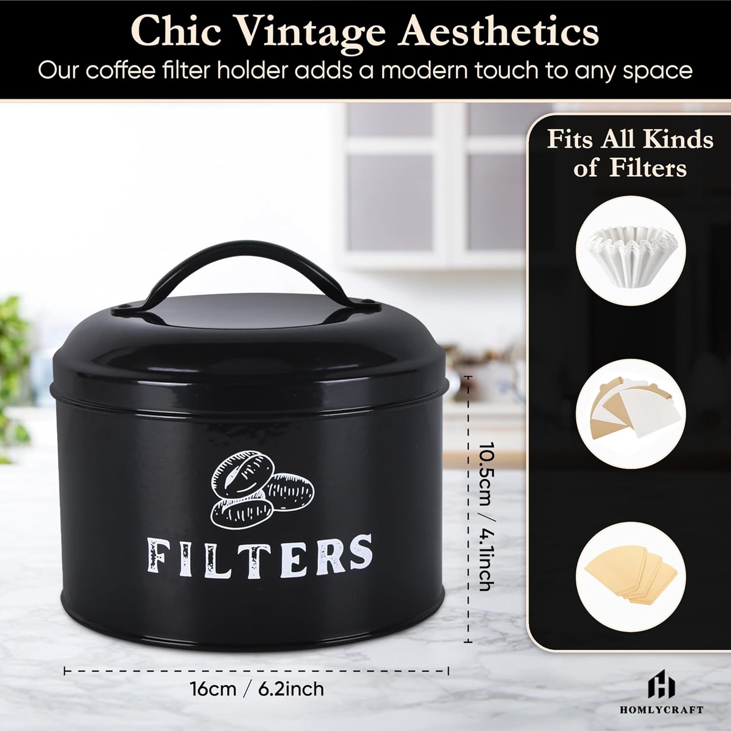 - Organize Your Coffee Filters: The coffee filter storage container has a durable, dustproof metal construction with lid and a spacious interior that allows you to store and protect coffee paper filters of all sizes and keep them at hand for easy preparation and pour-over.