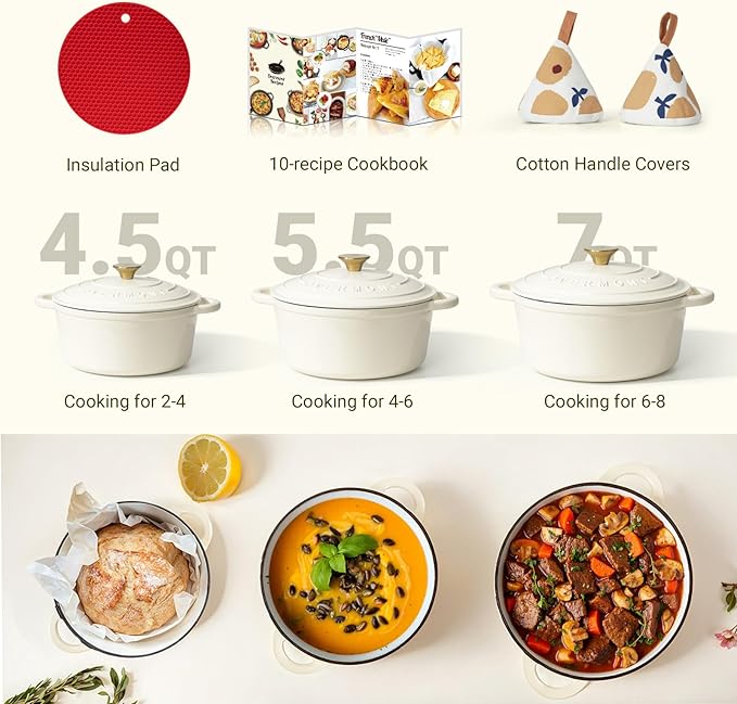 Overmont Enameled Cast Iron Dutch Oven - 4.5QT Pot with Lid Cookbook & Cotton Potholders - Heavy-Duty Cookware for Braising, Stews, Roasting, Bread Baking Cream White