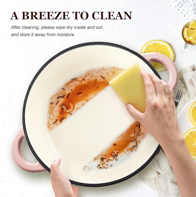 - Effortless Cleaning & Safety First: The flat and smooth enamel surface not only delivers a superior cooking experience but also makes cleaning a breeze. Easily remove food residues with a gentle wipe from a soft sponge or cloth. Additionally, we've included a cotton heat-resistant cap, ensuring a comfortable grip and safeguarding you from burns when handling the pot's handles and lid.