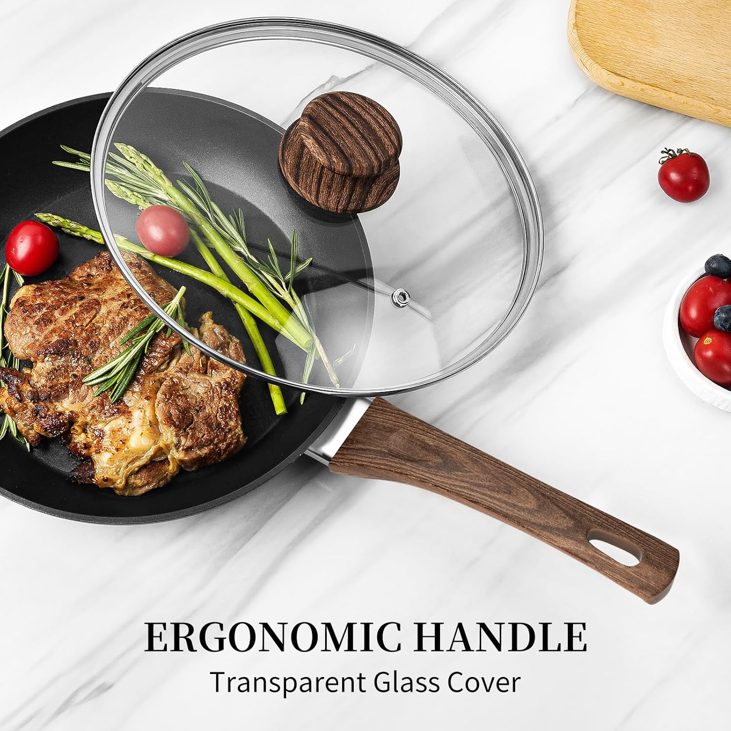 - 【Superior Non Stick Frying Pans】- Frying pans nonstick with lid set use excellent non stick coating technology, has superior abrasion resistance and extreme long-lasting. Nonstick frying pan gives us a healthy pan,less oil,non toxic,PFOA&APEO free.