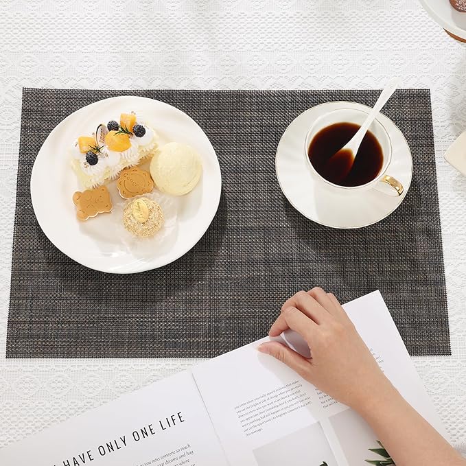 SHACOS Placemats Set of 6 Woven Vinyl Place Mats Wipeable Heat Resistant Plastic Non Slip Table Mats Indoor Outdoor, Black Brown