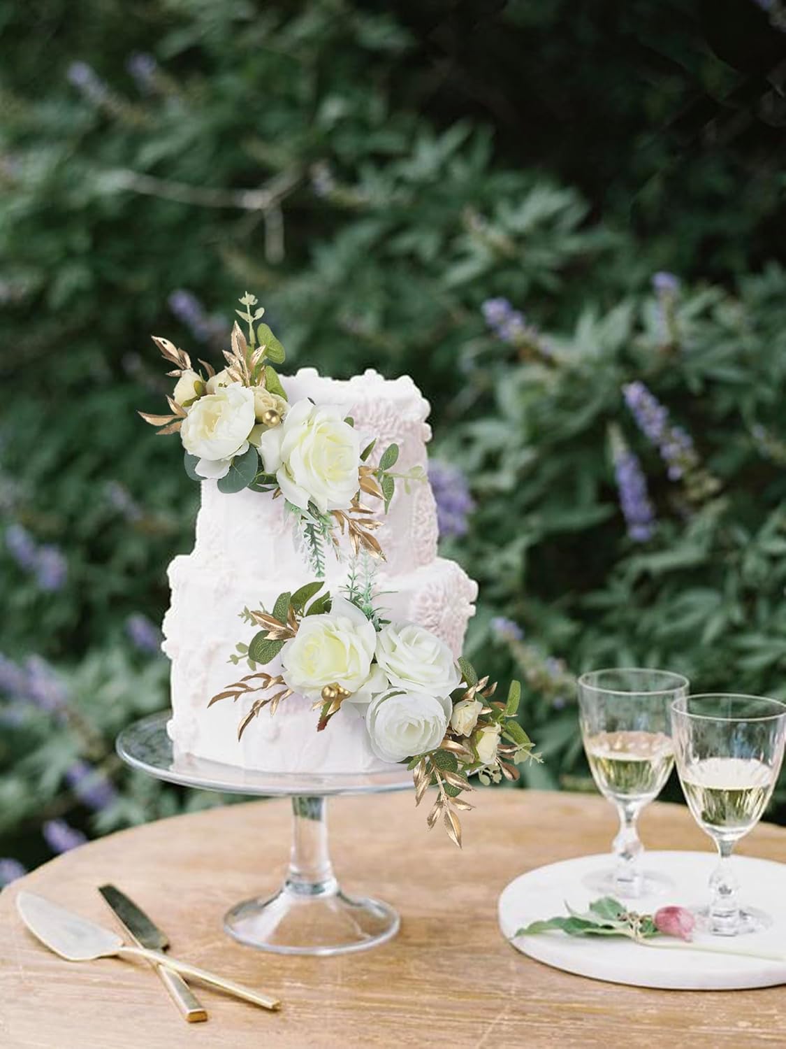 - Lush Green and Gold Accents: Each cake topper is enhanced with lush green foliage and subtle touches of gold, adding depth and dimension to the floral arrangement and creating a sense of opulence and luxury.