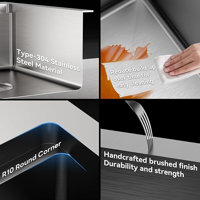 - [EASY TO CLEAN AND DRY] Rounded Corners design reduce build up over time for easy cleaning. X-SHAPED Waterline prevent water accumulation and keeps sink dry.Sandblasted matte texture creates an easy-to-clean surface and helps prevent water spots and fingerprints