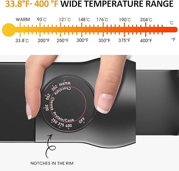 - Temperature Control: Our electric fondue pot features an adjustable temperature control knob, offering a range from 200℉ to 400℉. Powered by 1000W, it heats up rapidly and maintains a steady temperature.