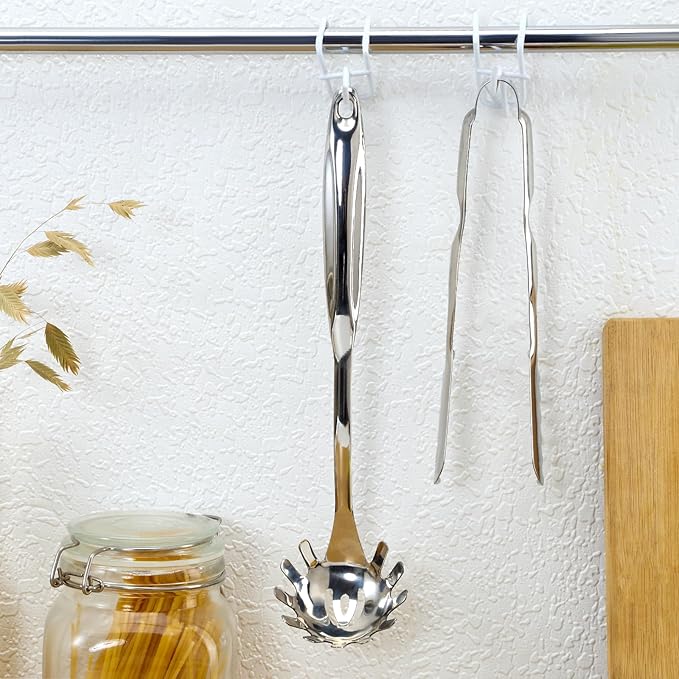 - 【Easy to Store and Clean】The end of the pasta ladle features a hanging loop for wall storage, saving valuable countertop space and keeping your kitchen tidy. With its stainless steel, seamless construction and excellent polishing process, the surface of pasta tools remains smooth and non-sticky, easily restored to cleanliness with dishwasher use or a simple rinse