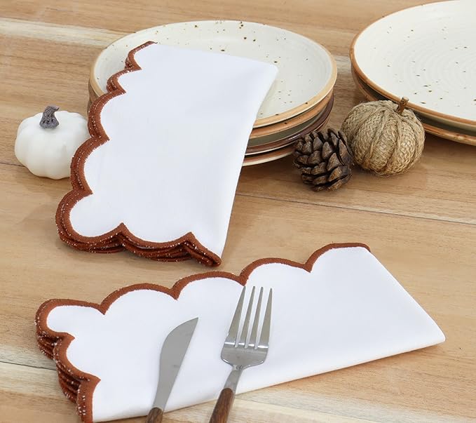 PurpleEssences Rust Scalloped Embroidery Cloth Napkins Christmas Holiday Winter Table Decor 100% Cotton Set of 4-18 x 18 inch - White - Edges - Rust