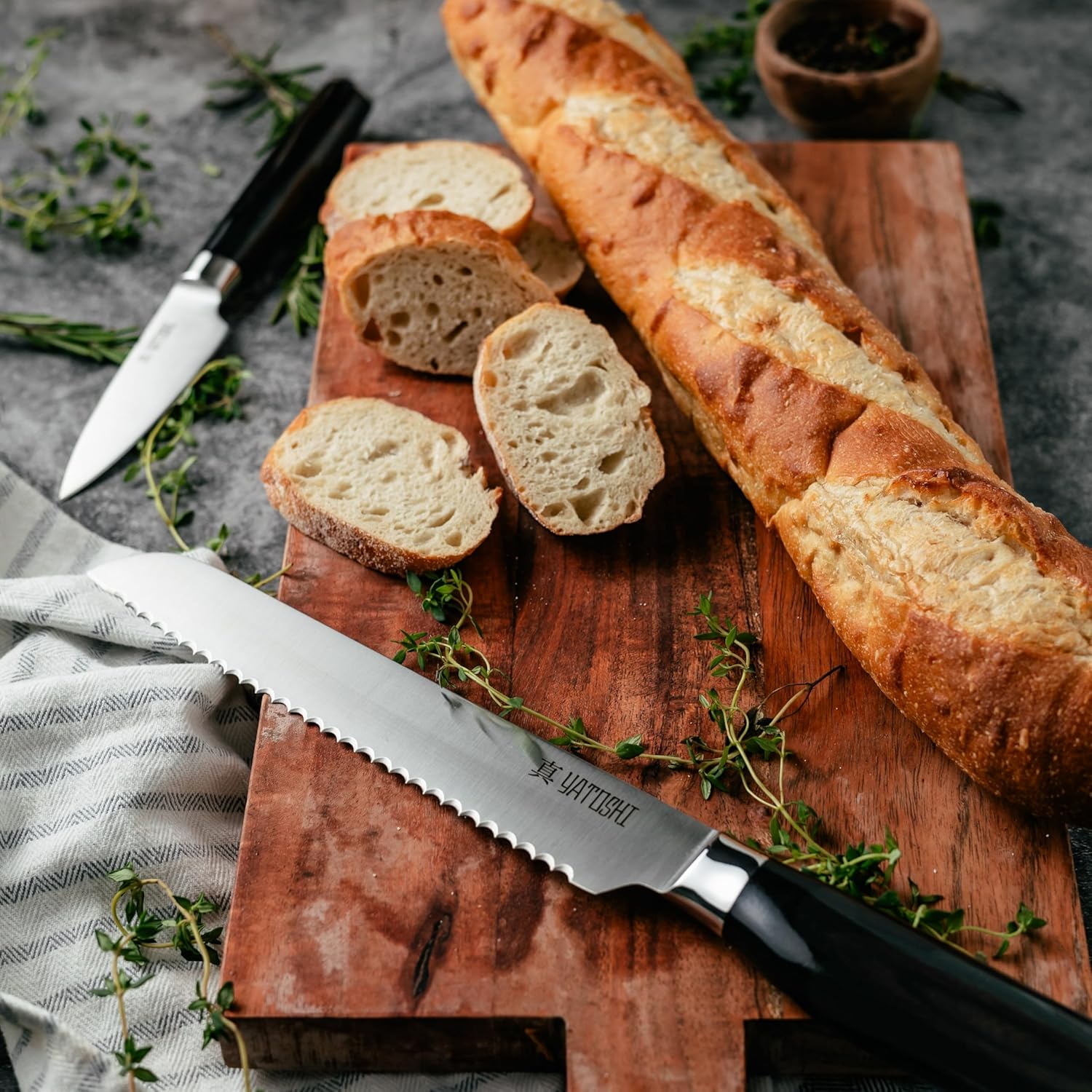 - Set Includes: 1x 8” Chef Knife, 1x 8" Bread Knife, 1x 3.5” Paring Knife