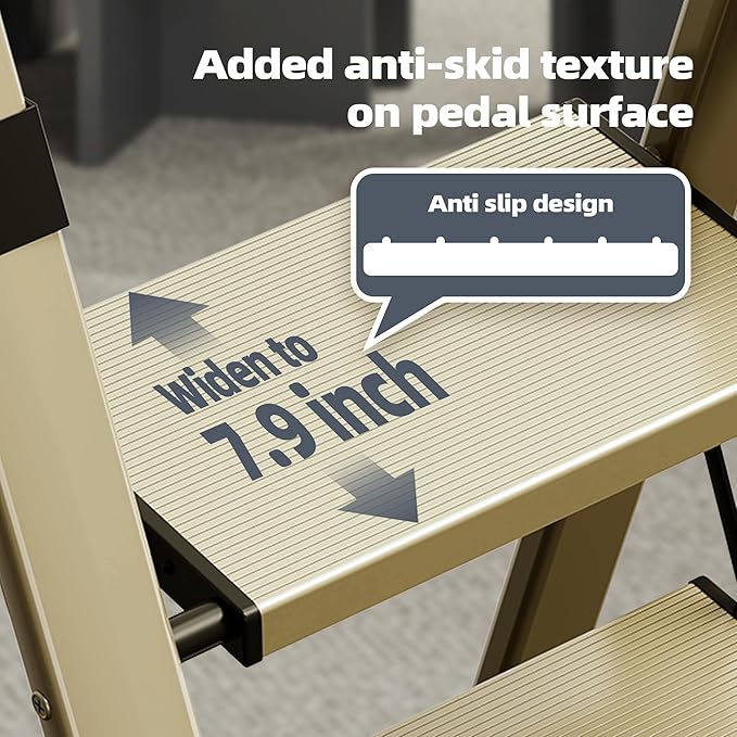 - ANTI-SLIP & WIDE PEDALS: This modern step ladder features large pedal steps with prominent parallel lines on the surface to prevent slipping. The wide pedals offer ample space for safe ascent and descent, allowing users to stand securely.