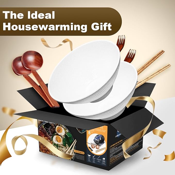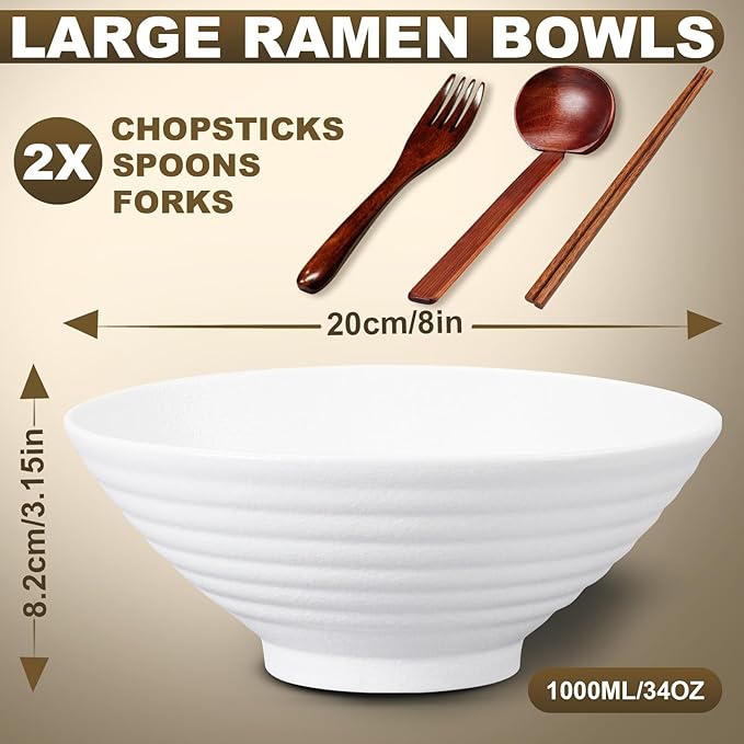 - LARGE CAPACITY: The YTLEMON Ramen Bowl Set contains 2 ceramic bowl of 1000ml/34oz capacity, 2 wooden Forks and ramen spoons, 2 pairs of wooden chopsticks.Each pasta bowl measures 20.3 cm/8 inches in diameter and 8.2 cm/3.15 inches in height. Comes with 1000DAYS electronic ramen cookbook for you