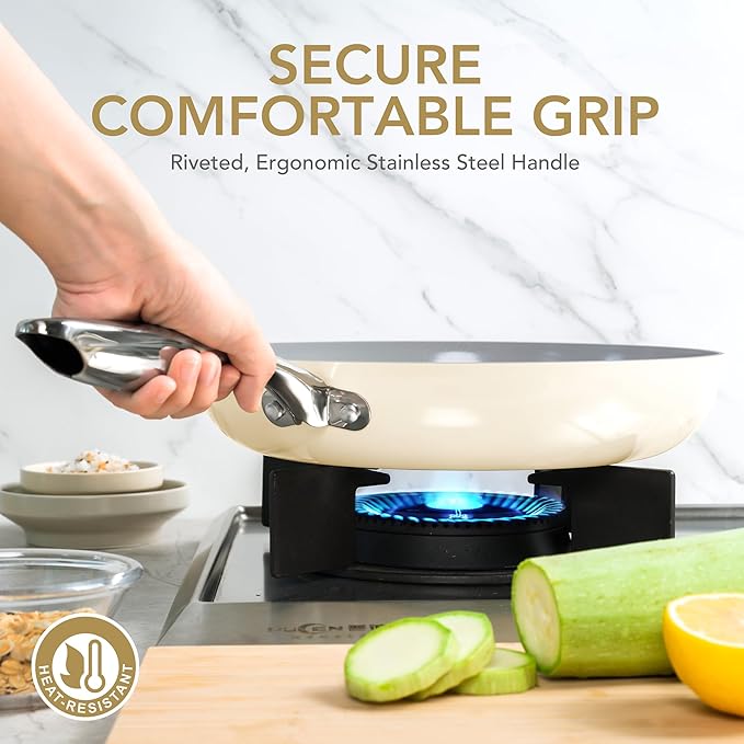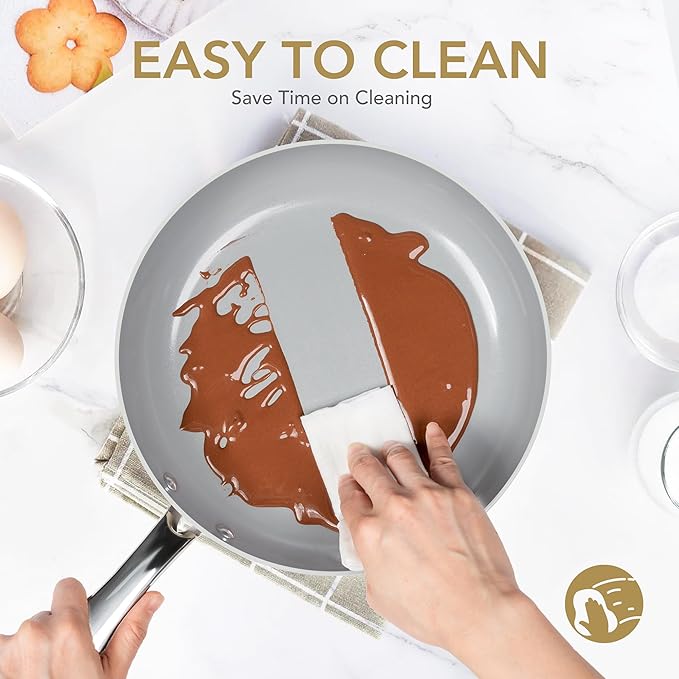 - Healthy Cooking Experience - Prioritize your health with our ceramic pan with lid, free from PTFE, PFOA, lead, and cadmium. Enjoy cooking without worrying about harmful chemicals leaching into your food.